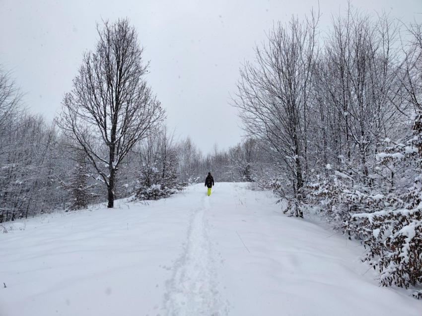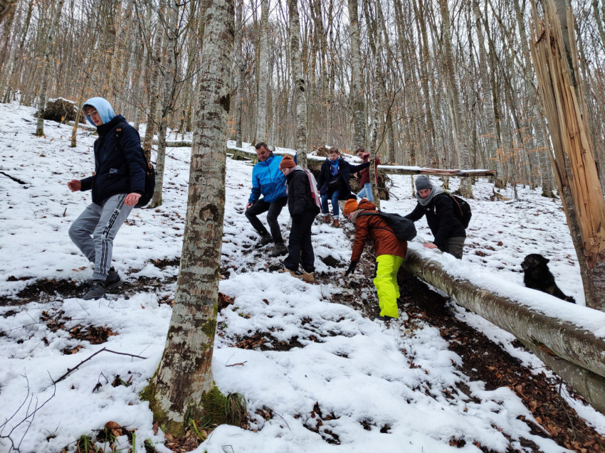 A hegyre meredek turistaúton ment fel a csoport hóesésben, ahol több mint 20 centiméteres friss hó fogadta őket.