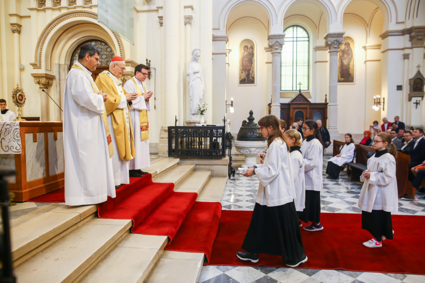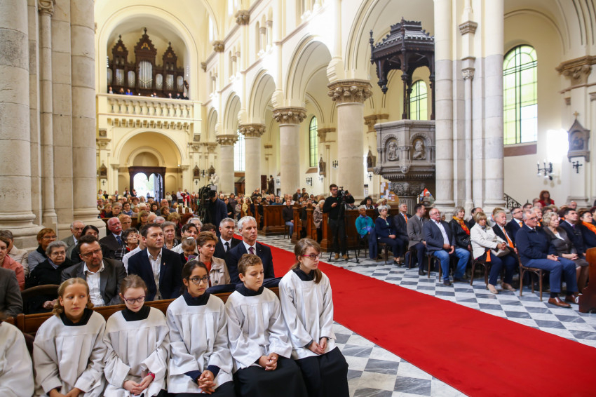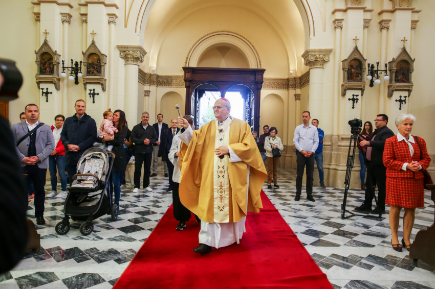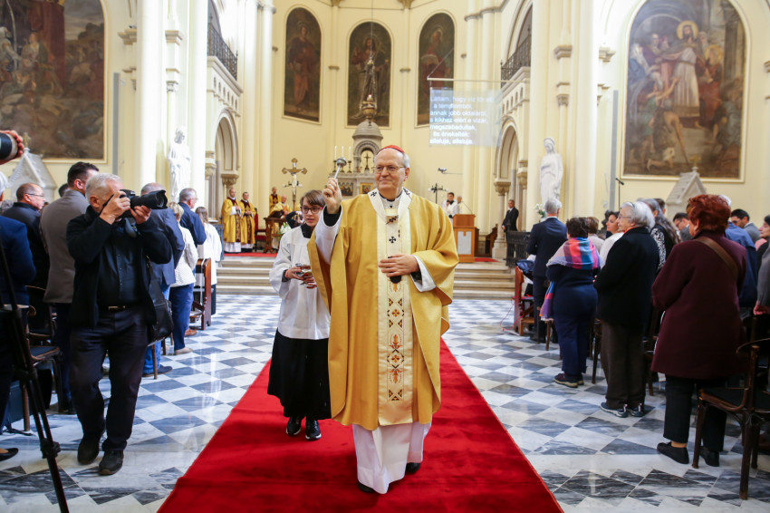 Mudra József, a plébániai képviselő-testület elnöke köszönti az egybegyűlt sokaságot. „Kérjük Erdő Péter bíborost, áldja meg a templomot, szentelje fel az oltárt az Úr áldozatának bemutatásra” – veszi kezdetét a szertartás a víz megáldásával, majd a főpásztor körbejár, és megáldja a falakat.