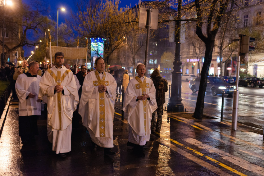 A húsvét vigíliájának szertartása a feltámadási körmenettel zárult: Erdő Péter bíboros vezetésével a hívők a bazilika falai körül hirdették a feltámadás örömét.