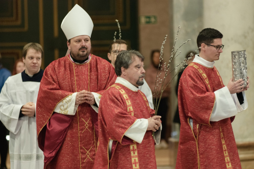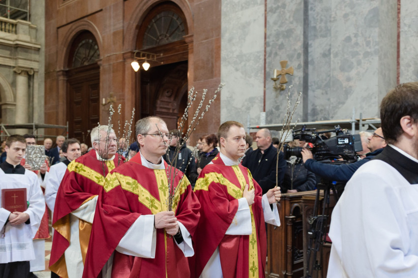 A barkaszentelés szertartása után a szentmisében a papnövendékek szkólája énekelte el a passiót, Krisztus szenvedéstörténetét. Erdő Péter bíboros homíliáját Török Csaba olvasta fel.