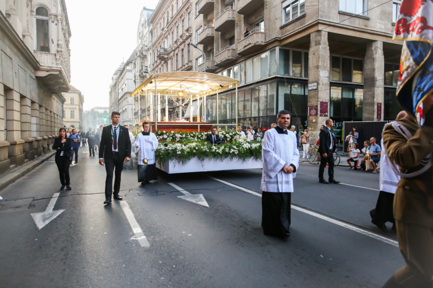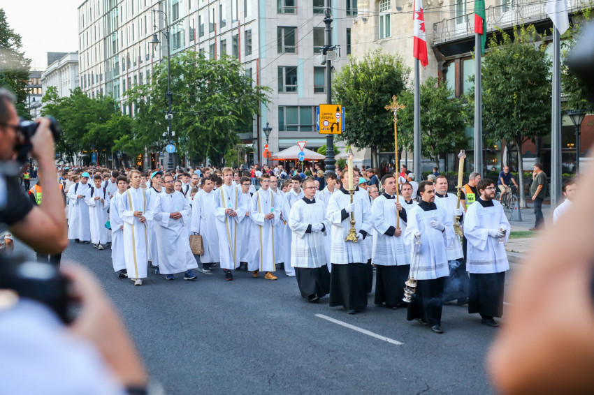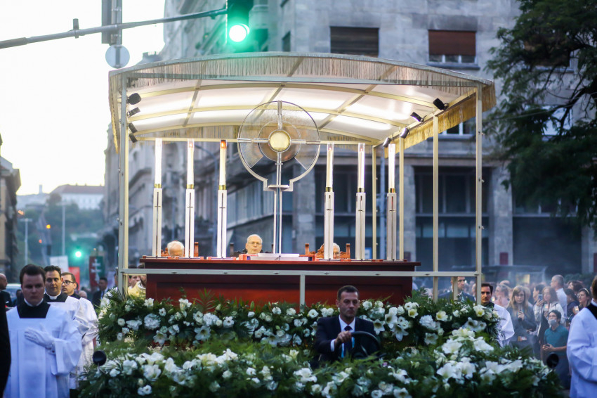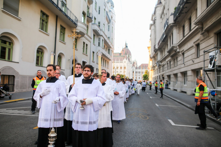 Ezt követően elindult az eucharisztikus körmenet. A hívek az Akadémia utcán és a József Attila utcán át vonultak az Andrássy útra, követve az Oltáriszentséget hordozó, virágdíszes autót. A hangszórókon keresztül rövid elmélkedéseket és imádságokat lehetett hallani – magyar és több idegen nyelven is –, és ismert egyházi énekek szóltak, melyeket a több tízezer zarándok együtt énekelt. Amikor felcsendült a kongresszus himnuszának refrénje: