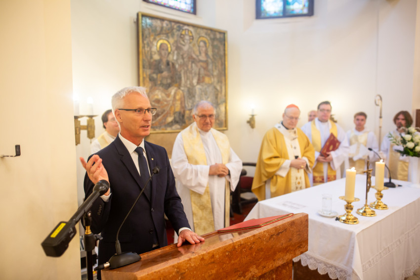 Ezt követően Soltész Miklós államtitkár szólt a megjelentekhez, aki felidézte, hogy három testvére is ezen a helyen kötött házasságot. Kiemelte, a környező épületek bemutatják, milyen jelentős épületeket emeltek őseink. Napjainkban Budapest számos temploma megújulhatott, közöttük ez a kápolna is. „Kívánom, hogy a hívek töltsék be lélekkel ezt a helyet, és Szent Pio atya üzenetét a következő években is hirdessék a világnak” – zárta beszédét Soltész Miklós államtitkár.