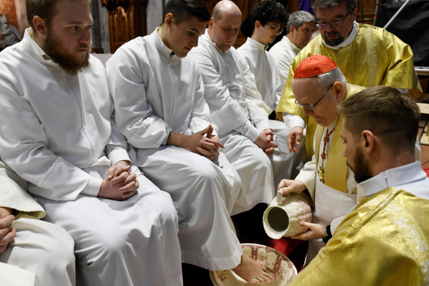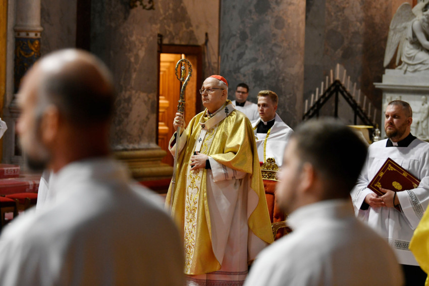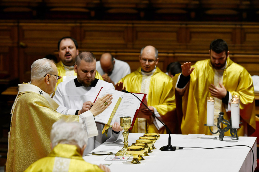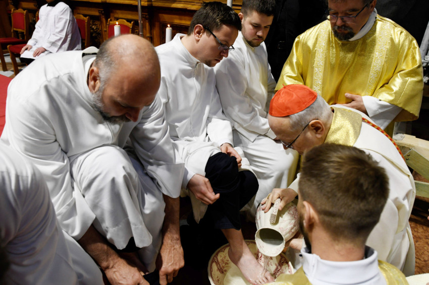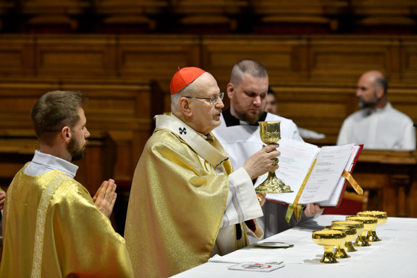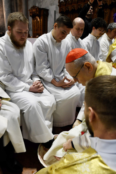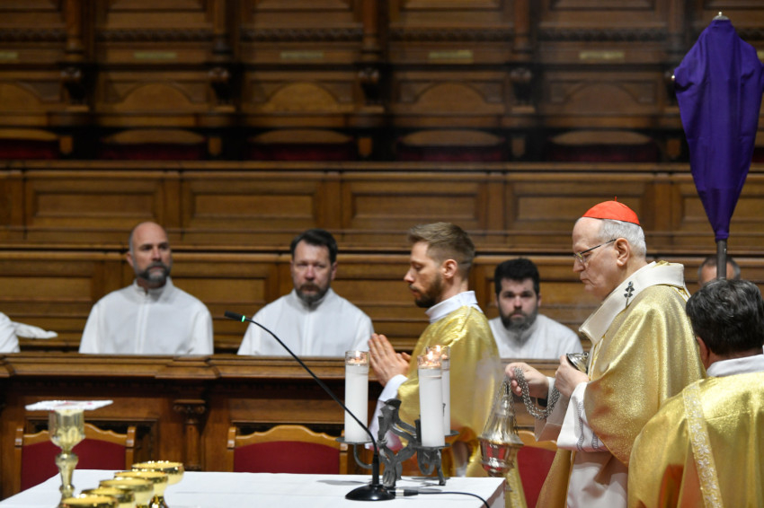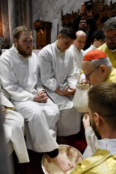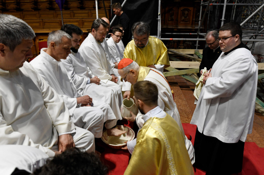 A bíboros homíliájában emlékeztetett: három fő titkot ünneplünk a nagycsütörtök esti szentmisében: az Oltáriszentség és az egyházi rend szentségének alapítását, valamint a testvéri szeretet parancsát. Ezért ez az egyetlen húsvéti titok szentségi pillanata.