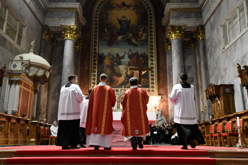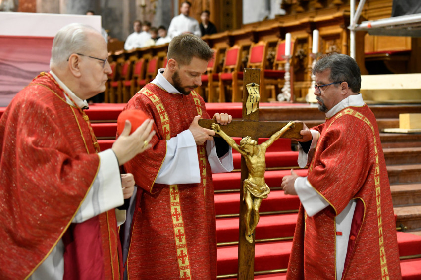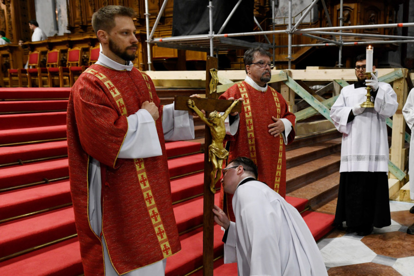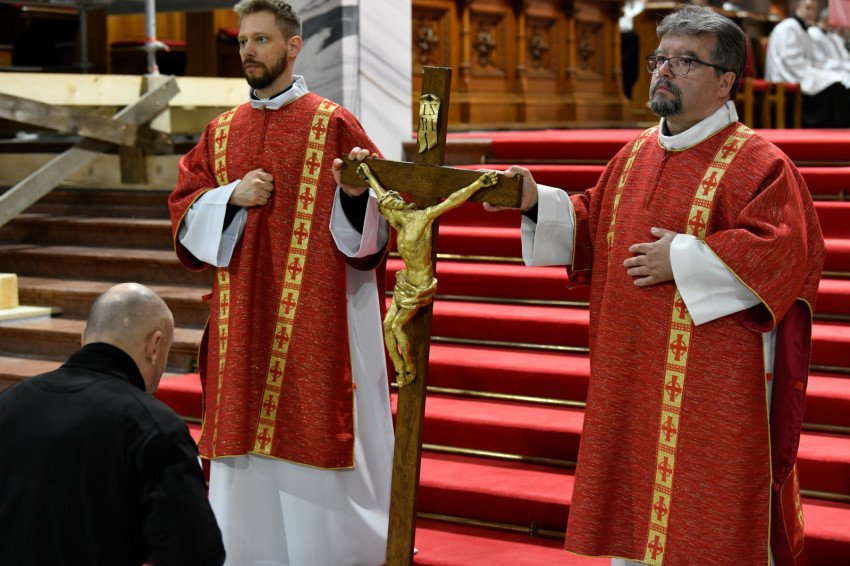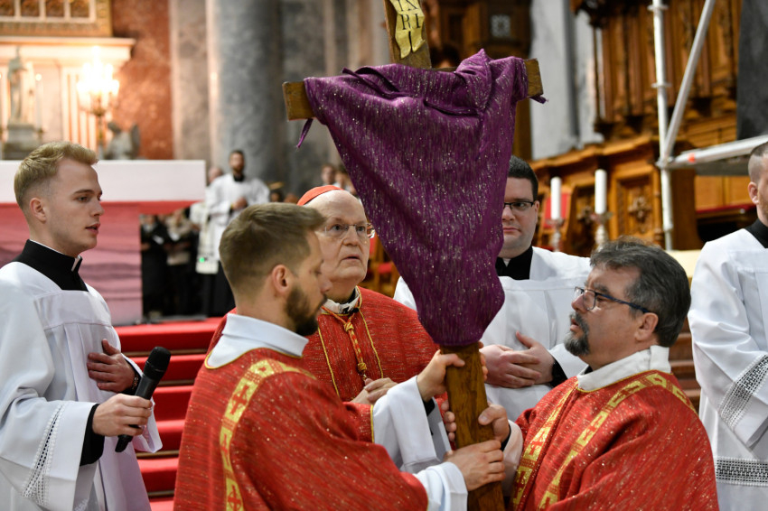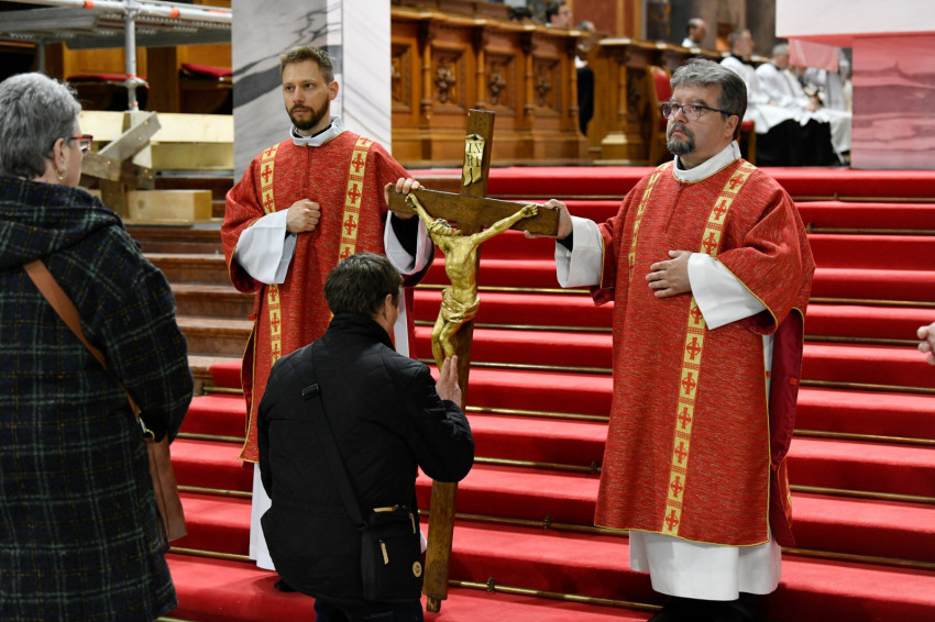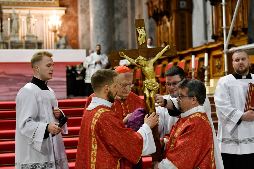 Erdő Péter bíboros a homíliájában rámutatott: Krisztus kereszthalála az Atyának mindhalálig engedelmes Istenember szeretetének drámája. Nem a fizikai szenvedés, hanem az engedelmes szeretet éri el benne csúcspontját a világ történetében. Krisztus mindenkiért meghalt, és azért halt meg mindenkiért, hogy akik élnek, ne maguknak éljenek, hanem annak, aki értük meghalt és feltámadt. A főpásztor kiemelte: előttünk a szabadság lehetősége, előttünk a viszontszeretet útja.