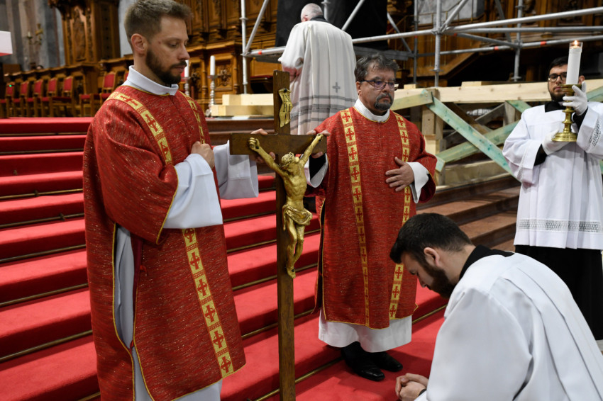 A csendes bevonulást követően, a szertartás kezdetén a főpásztor letérdelt a lecsupaszított oltár előtt, és csendben imádkozott az asszisztenciával. Így hódoltak a Golgotán bemutatott áldozat, az önmagát kiüresítő Jézus előtt. Ezt követően a papnövendékek és a bazilika kórusa elénekelte a passiót Szent János evangéliumából, felidézve Jézus utolsó óráit és kereszthalálát.
