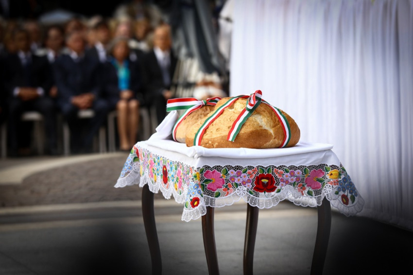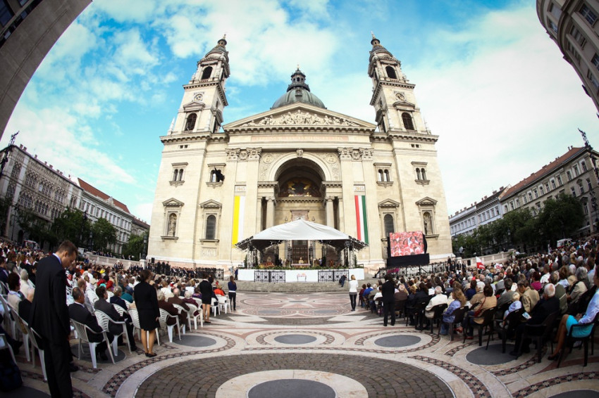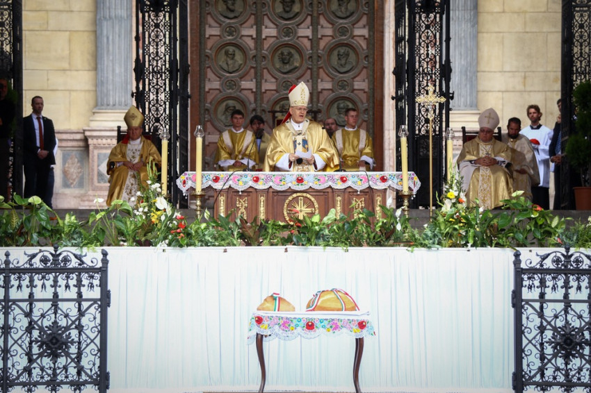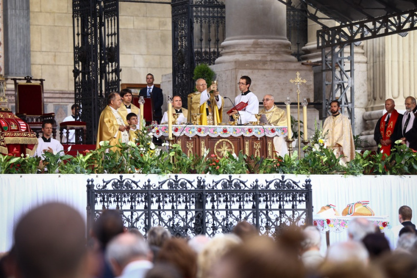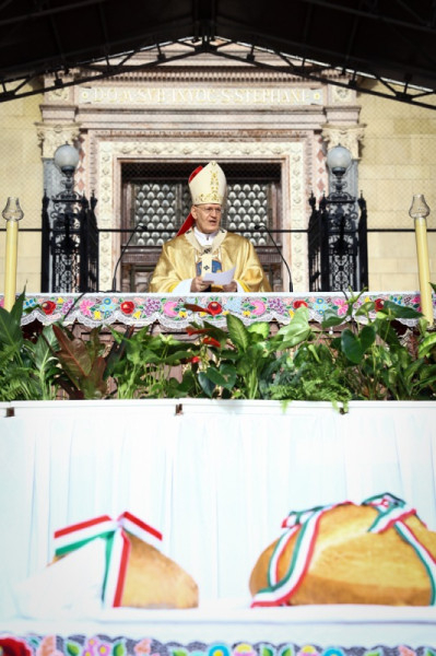 Erdő Péter bíboros, aki az ünnepi szertartás főcelebránsa és szónoka is volt egyben, a Magyar Katolikus Püspöki Konferencia tagjaival és Alberto Bottari de Castello apostoli nunciussal együtt mutatta be a szentmisét. Szent István király ünnepén arra emlékezünk, hogy hogyan lehet a keresztény hit erejében és örömében országot építeni – fogalmazott a szentmise elején mondott köszöntőjében a a főpásztor. Első szent királyunk tanácsát kérjük a megmaradáshoz – intett a bíboros –, mert az az alap, amelyre ő országunkat építette, ezer éven át tartósnak bizonyult. Vallatjuk örökségét, kérjük közbenjáró támogatását, hogy az ő szellemében kapjunk eligazítást történelmünk változó körülményei és drámai kihívásai között – tette hozzá. Ezt követően a bíboros megáldotta az új kenyeret.