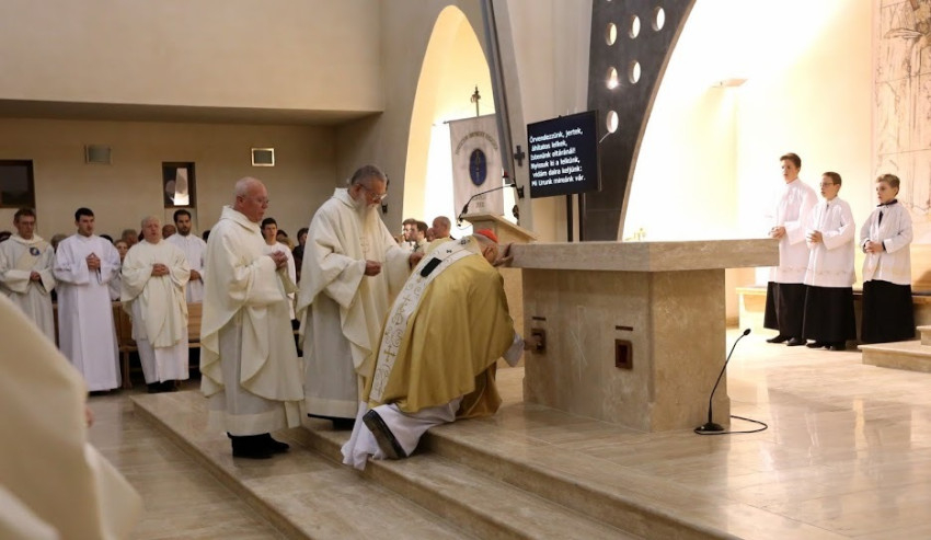 A homíliát követően folytatódott a templomszentelés szertartása. Az oltárszentelést és a Mindenszentek litániáját követően az oltár márványtalapzatában elhelyezték Szent Adalbert és Boldog Meszlényi Zoltán ereklyéit, s végül felszentelték a templom felszerelését: az oltárt leterítették, feszületet helyeztek rá. A szentmisében Erdő Péter meggyújtotta az örökmécset.