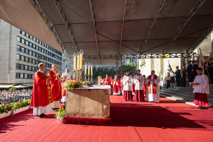 Ünnepélyesen a bazilika lépcsőjére vonultak az intézmények zászlóival az erre felkért diákok. Harangzúgás töltötte be a teret, amire a több ezer résztvevő elcsendesedett. „Veni, Sancte Spiritus” – szólt az ének a bevonulás alatt.