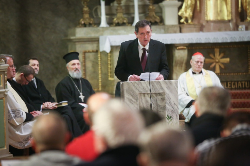 Erdő Péter bíboros Izajás próféta békéről szóló látomásából kiindulva elmondta: mintha egy emberhez méltóbb kor jött volna el számunkra a hetven évvel ezelőtti időhöz képest. A prófétai perspektíva más, hiszen a teljes béke és a teremtett világ tökéletes harmóniája az Alkotójával olyan ígéret, amely a messiási jövőben teljesedik be. Mégis, nekünk is van okunk a hálaadásra a saját életünkben. Ezért fel kell tennünk a kérdéseket: hogyan őrizhetjük meg és építhetjük tovább az isteni ajándékot, hogyan tudjuk tisztelni Istent és az embereket, akiket Isten a saját képére alkotott?