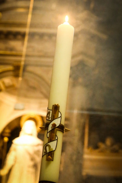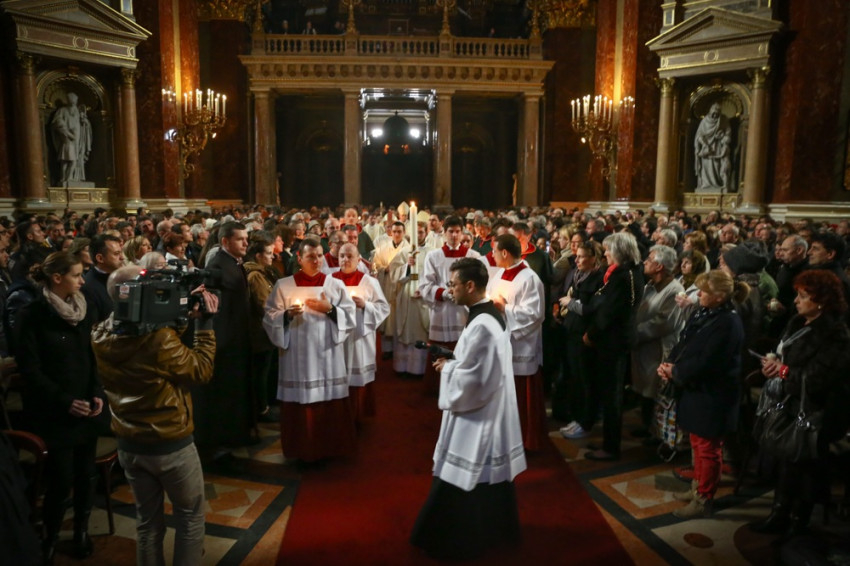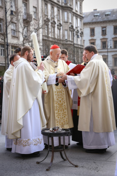 A szertartás a fényünnepséggel vette kezdetét. Ennek keretében végzett tűzszentelést Erdő Péter bíboros a templom előtti téren, majd az új tűzről meggyújtották a Krisztus világosságát jelképező húsvéti gyertyát. A tűzszentelést követően a bíboros, a koncelebráló püspökök, papok és a ministránsok bevonultak a sötétben lévő bazilikába, ahol a húsvéti gyertyáról meggyújtották a templom gyertyáit és a híveknél lévő gyertyákat is. A szertartás folytatásaként elhangzott az Exultet, a húsvéti örömének, ami után az igeliturgia következett. A Márk evangéliumából vett utolsó bibliai rész előtt tért vissza az Alleluja-ének, amelyet egész nagyböjtben nélkülöz a katolikus liturgia.