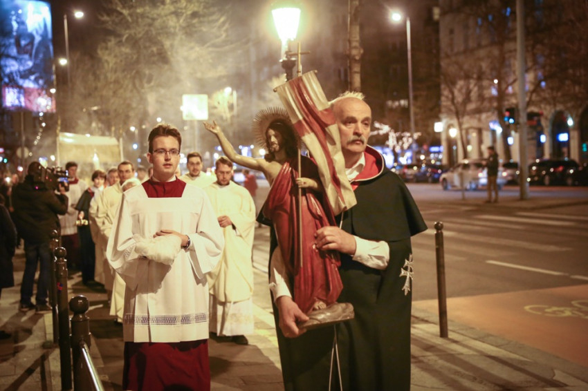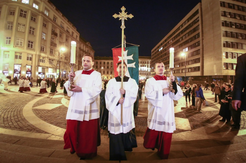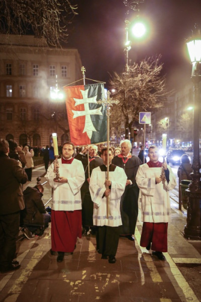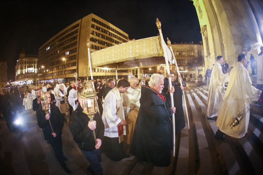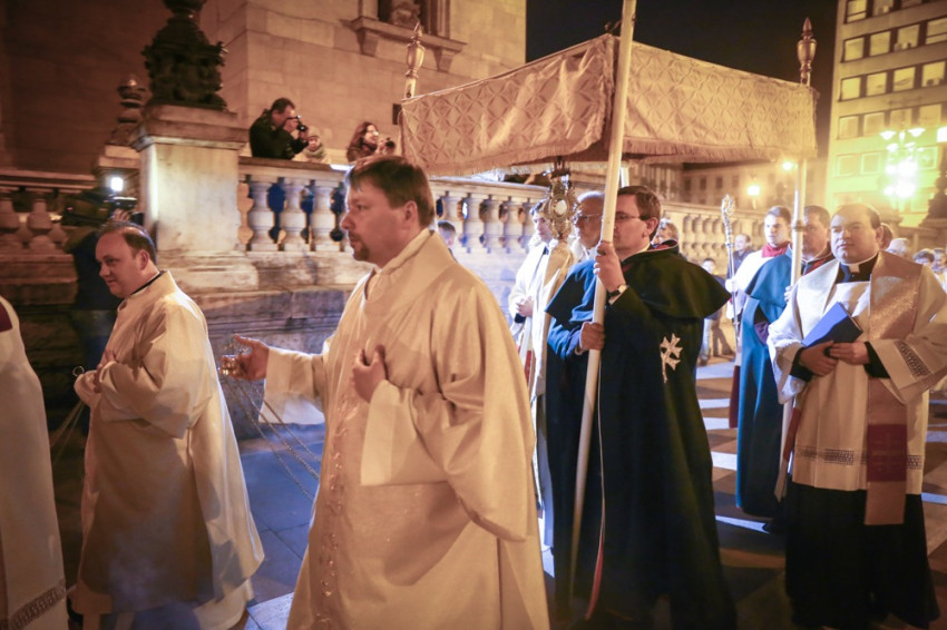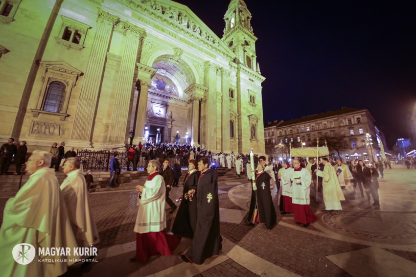 A liturgia az áldozati résszel folytatódott, majd sor került a hagyományos feltámadási körmenetre, amelyet Erdő Péter bíboros vezetett a bazilika körül.