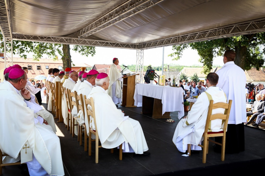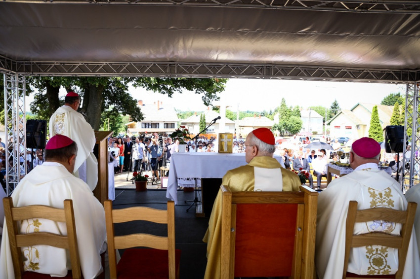 Veres András szombathelyi megyéspüspök mint vendéglátó köszöntőjében felidézte gyermekkora mondását, hogy egy újmiséért érdemes akár egy pár csizmát is elkoptatni, mennyivel inkább így van ez – folytatta a főpásztor – a mai centenárium alkalmával. Ezt követően a megyéspüspök felidézte Mindszenty József visszaemlékezését, mely a településhez, szülőházához kötötte: „Soha ki ne fakuljon emlékezetünkben az a ház, amely bölcsőnket ringatta”. Veres András köszöntőjének végén ünneplésre, hálaadásra és Mindszenty József boldoggá avatásáért való imádságra kérte a jelenlévőket.