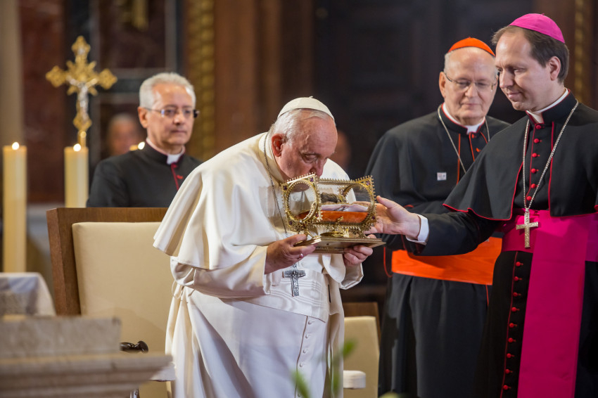 – Az apostoli látogatás első egyházi programja a Szent István-bazilikában kezdődött, amikor a Szentatya első szent királyunk ereklyéje, a Szent Jobb jelenlétében találkozott a püspökökkel, papokkal, diakónusokkal, szerzetesekkel, papnövendékekkel és lelkipásztori munkatársakkal. A találkozó végén kezébe vette és megcsókolta a Szent Jobbot. A beszédében is kiemelte, hogy Szent István a Szűzanyára bízta az országát.