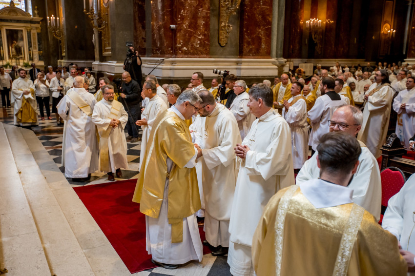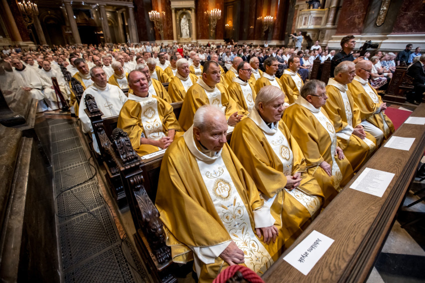 Megtelt ünneplőkkel a Szent István-bazilika szombaton délelőtt. Együtt ünnepelt a főpásztorral Marton Zsolt váci megyéspüspök; Fábry Kornél, Martos Levente Balázs és Mohos Gábor, a főegyházmegye három segédpüspöke; egyházmegyés papok és diakónusok, szerzetesek, a szentelendők családtagjai, hozzátartozói és a plébániáikról érkezett ünneplők. Erdő Péter a szertartás kezdetén köszöntötte az ünnepi szentmisén koncelebráló jubiláns papokat és a bazilikát megtöltő híveket.