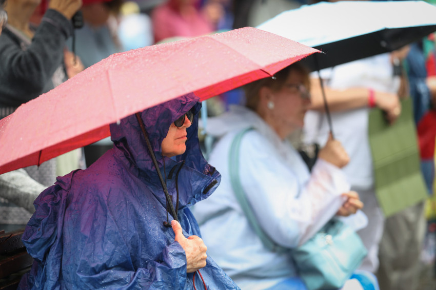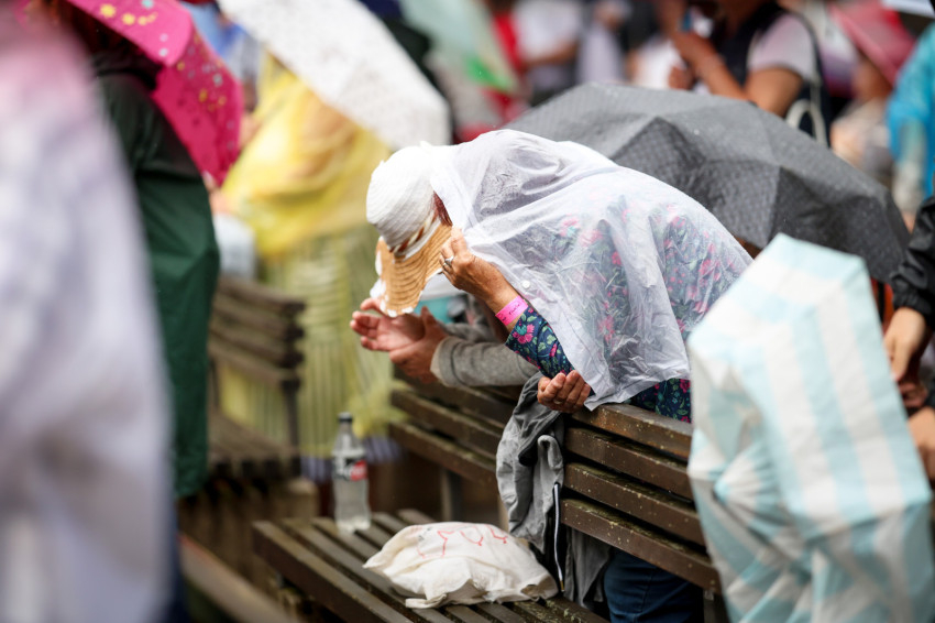 Az eső egyre inkább eleredt, de a zarándokok teljes fegyelmezettséggel hallgatták a szentmise olvasmányait. A szakadó eső aztán a bíboros prédikációja alatt elállt.