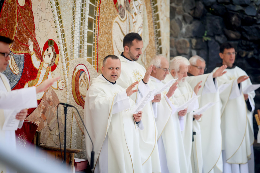 Harangszóra a bazilikába vonult Erdő Péter és Orosz Lóránt kegyhelyigazgató, elimádkozták a szentmise előtti imádságot, majd ünnepélyesen kivonultak a szabadtéri oltárhoz. Szép szakmári lányok vitték a Mária-szobrot népviseletbe öltözve, miközben felhangzott az ének a refrénnel: „Nem vagyunk árvák, van édesanyánk, ki a magas mennyekből gondot visel ránk, palástoddal takarj be, úgy vigyázz reánk.”