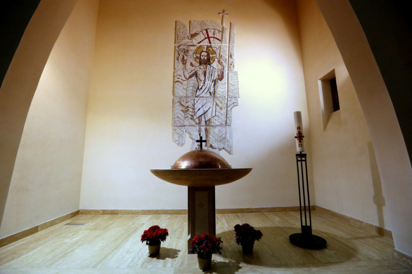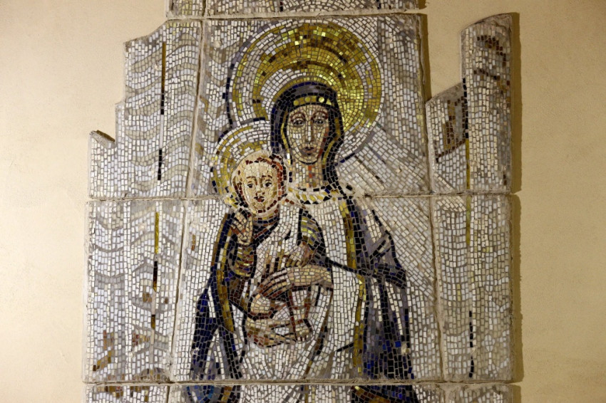 A szentbeszédet követően Erdő Péter bíboros megáldotta a templom mostanra elkészült három mozaikját, amelyek Tölg-Molnár Zoltán Munkácsy Mihály-díjas festőművész alkotásai. A szentélyben lévő nagyméretű, körülbelül 14 négyzetméteres kép a templom védőszentjét, Boldog Meszlényi Zoltánt, valamint a plébánia és a főegyházmegye védőszentjét, Szent Adalbertet ábrázolja. A jobb oldali keresztelőkápolna mozaikján a feltámadt Krisztus, a bal oldali mellékkápolna hátfalán pedig Szűz Mária látható a gyermek Jézussal. A felhasznált kövek nagyobb részben muranói üvegmozaikok, kisebb részben hazai alapanyagból készültek.
