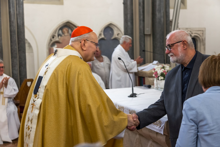 A szentmise végén, még a záró áldás előtt Osztie Zoltán plébános a templom borát és egy, a plébániaközösség által készített emlékplakettet ajándékozott a bíborosnak, megköszönve, hogy „briliáns” felkészültségével, rendkívüli tudásával oly sokat tett a magyar és a világegyházért. Rengeteg segítséget kapott tőle a belvárosi templom és az itteni közösség is. Külön köszönet illeti bíboros atyát azért az áldozatos munkáért, amit a 2021-es budapesti Nemzetközi Eucharisztikus Kongresszusért és az idei pápalátogatásért végzett.