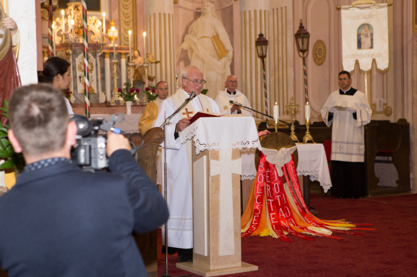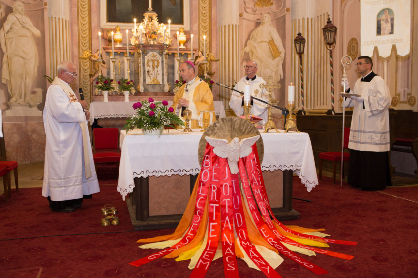 A szertartás elején Illés Sándor plébános köszöntőjében elmondta: a főegyházmegye jelmondata – „Őseink hite, a jövő reménye” – már évtizedek óta, különösen az egykori Almád település apátságának feltárását követően fontos üzenet a település számára.