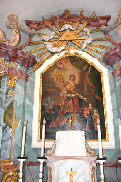 Az oltárkép Szent Miklóst ábrázolja, jobbján egy tengeren hánykolódó vitorlással, melyből az imádkozó szakállas szent hajol ki, mellette egy hajós az árbocot átkarolja. Középen áll Szent Miklós püspöki ornátusban, jobbjával pásztorbotját szorítja magához, kezében pedig evangéliumos könyvet tart, amelyen a három aranygolyó nyugszik. Nyitott tenyerű bal kezét segítőn nyújtja a balján térdeplő három lány felé. A jelenetek a Szent Miklóshoz köthető két közismert csodatételt mesélik el – népies barokk felfogásban, de jó kvalitásban.