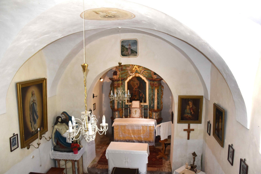 A szentélyt dongaboltozat fedi, melyet felül, a padlástér felől egy hevederrel láttak el. Keleti, résszerű ablaka keretezés nélküli, eredetinek tűnik. Ezt az ablakot a templombelső felől ma teljesen kitakarja a 18. század harmadik negyedéből való barokk oltár, amelynek így minden bizonnyal volt egy korábbi, alacsonyabb előzménye. A mostani oltárt erőteljes párkányba golyvázódó kompozit fejezetes oszlopok és pilaszterek keretezik, melyek átlósan kifordulnak a templom tere felé. A retabló két szélén C alakba rendeződő, szeszélyesen kanyargó akantuszornamentika fut fel. A tört vonalú, íves oromzatban istenszem látható. Az oltárkép két oldalán egy-egy szentszobor állt (az egyik a helyiek elmondása alapján Nepomuki Szent Jánosé volt), továbbá két angyalszobor, de jelenleg nincsenek itt.