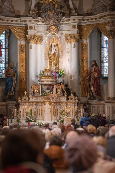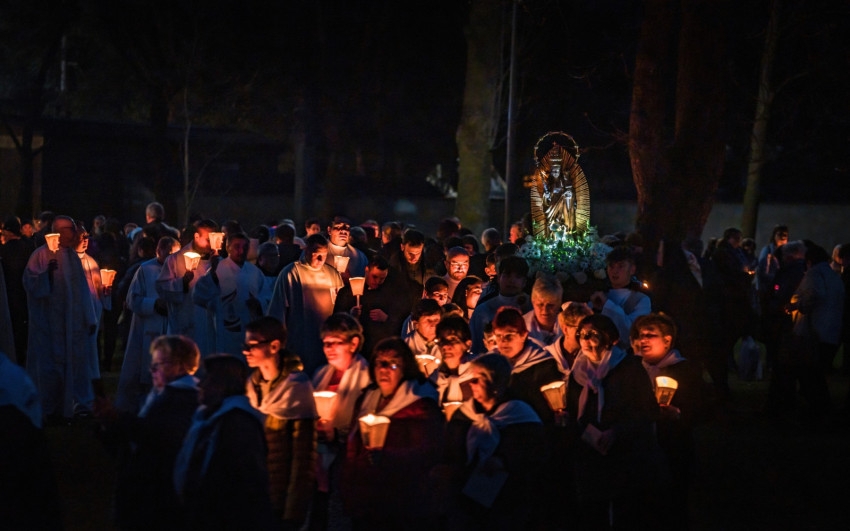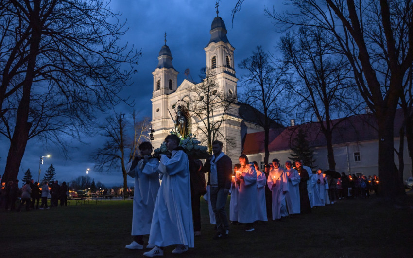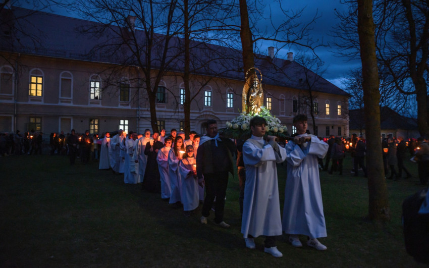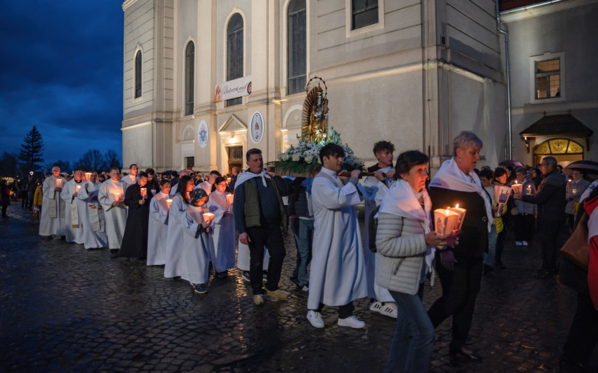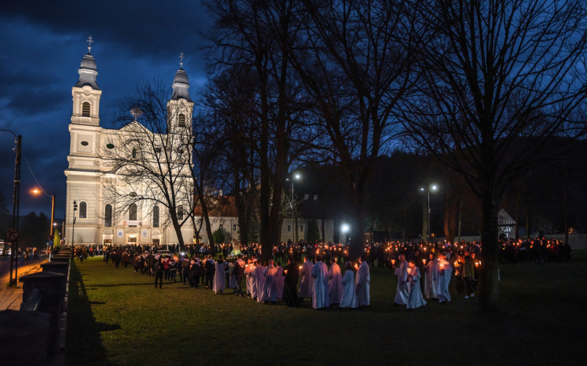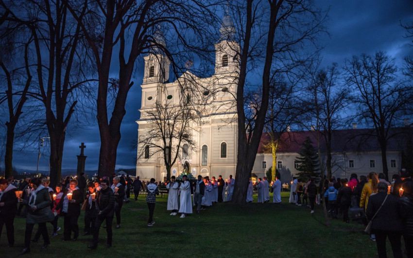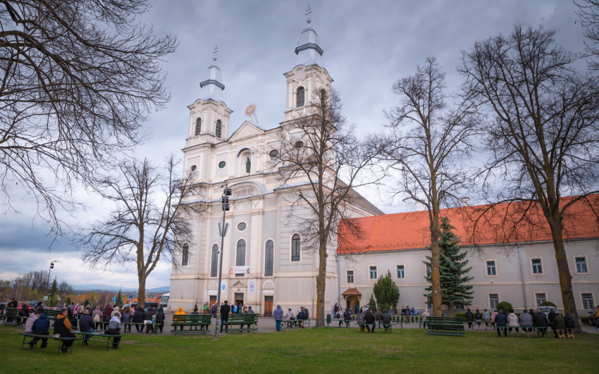 Hűvös, borongós kora tavaszi időjárás fogadta az áprilisi Mária-köszöntő résztvevőit Csíksomlyón, ennek ellenére zarándokok százai érkeztek a kegyhelyre. Sokan közülük a kolostor folyosóin várakoztak, hogy elvégezhessék szentgyónásukat.