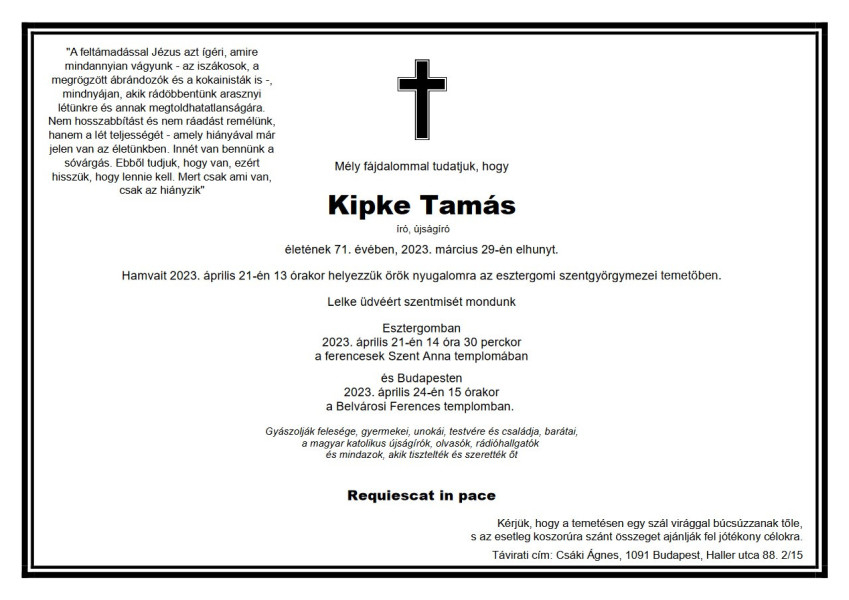 A katolikus író, újságíró lelki üdvéért a temetési szertartást követően Esztergomban, a ferencesek Szent Anna-templomában mutatnak be szentmisét 14 óra 30 perckor.