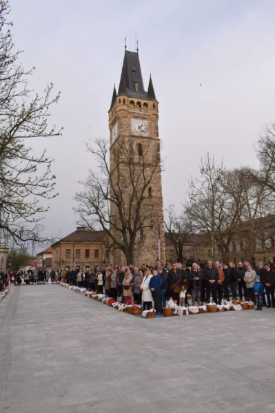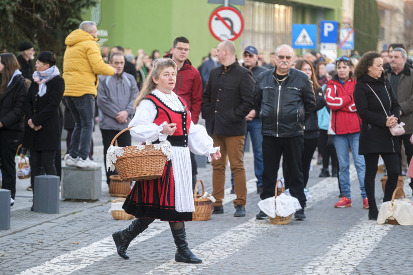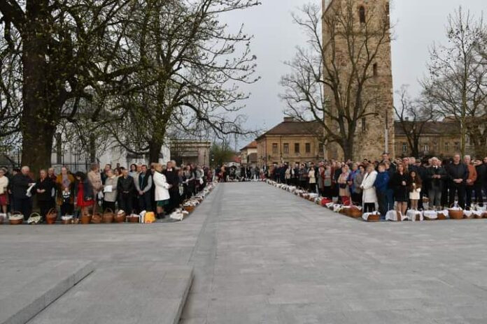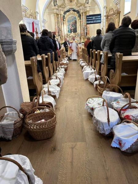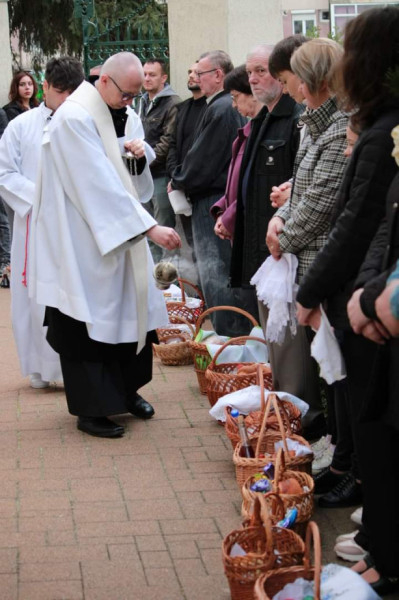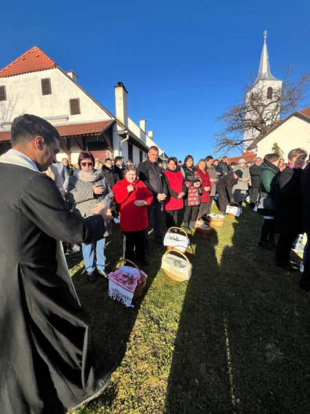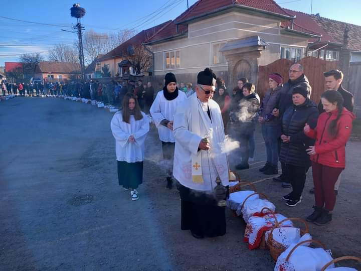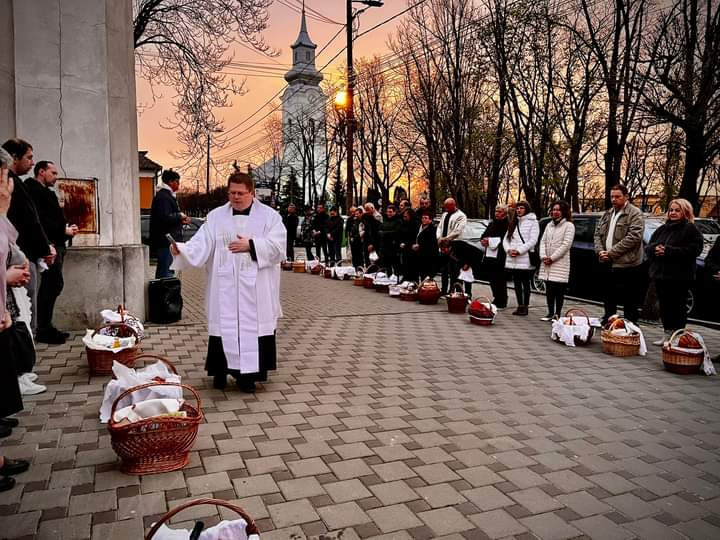 Az ünnepi szentmisére érkező keresztény közösség tagjai idén is rendezett sorokban, kosaraikat maguk elé a földre helyezve vettek részt a szertartáson. A liturgiát követően Tamás József nyugalmazott püspök a papság és a ministránsok kíséretében szenteltvízzel meghintette a kosarakban lévő ételeket. A püspök beszédében arra kérte a híveket, hogy ne felejtsék el a kereszténység legnagyobb ünnepének üzenetét.