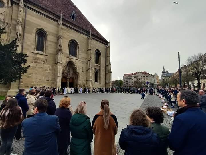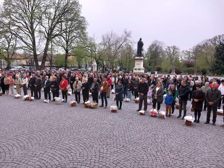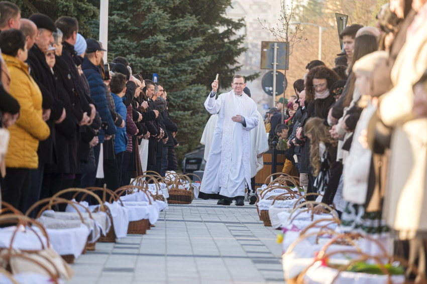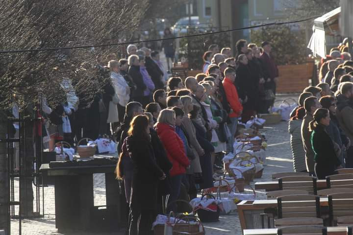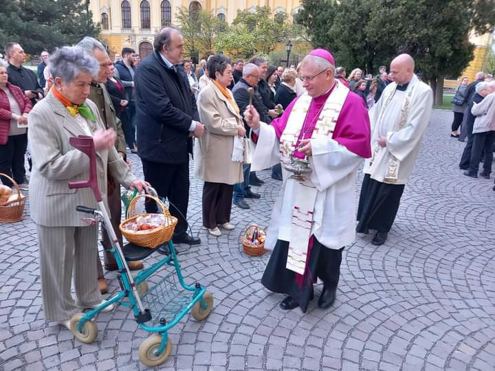 Húsvétvasárnap kora reggelén Böcskei László megyéspüspök megszentelte az ételeket a nagyváradi székesegyház előtti téren.