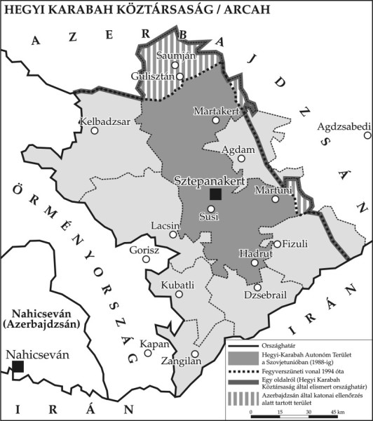 – Egészen pontosan háromról. Van a Szovjetunió idején létezett Hegyi-Karabah. Ezt úgy kell elképzelni, mint mondjuk – ha magyar analógiát szeretnénk kicsit szakmaiatlanul használni – Székelyföldet, amely egy területileg körülhatárolható örmény etnikai tömb – kvázi sziget – Azerbajdzsán területén. Ezt követte az 1994-es tűzszünet után létrejövő Hegyi-Karabah Köztársaság, mely 2020 novemberéig létezett. Ez illeszkedett, közvetlenül határos volt területileg is, Örményországhoz, mert a háborúban az örmény hadsereg hét körzetet elfoglalt Azerbajdzsántól, azon területekből, amelyek a Szovjetunió időszaka alatt nem tartoztak a Hegyi-Karabah autonóm régióhoz. Az említett hét körzetet, valamint Szovjetunióbeli Hegyi-Karabah autonóm terület jelentős déli részét szerezték vissza 2020-ban az azeriek. A megmaradt területen [szigetszerűen Azerbajdzsán területén – a szerk.] – ez a harmadik, a mostani Hegyi-Karabah – továbbra is teljes egészében és kizárólag örmények élnek, ugyanakkor az itt élő örmények védtelenebbek, mint bármikor korábban: Örményország a 2020-as megállapodás értelmében kivonta fegyveres csapatait Karabahból és