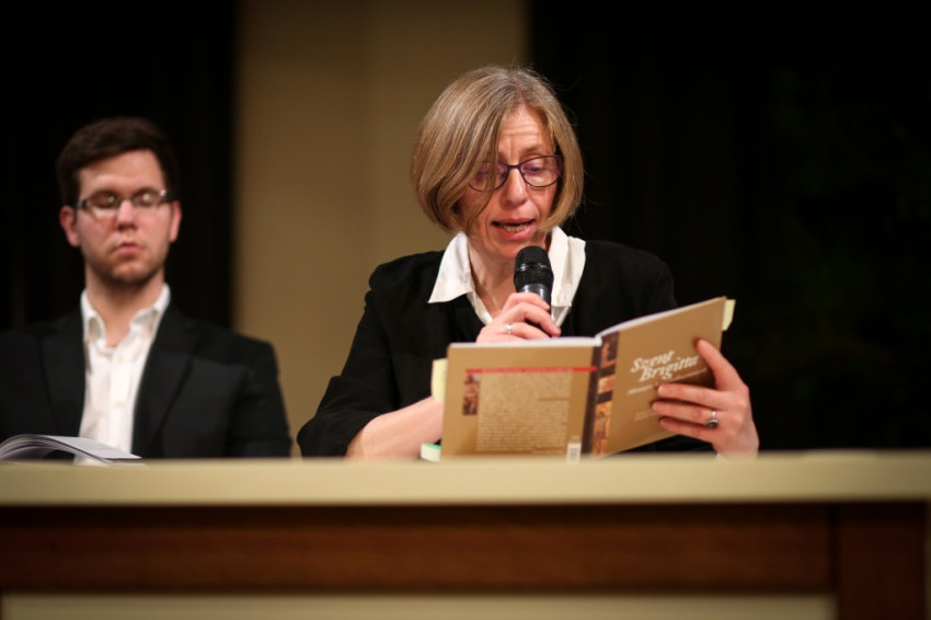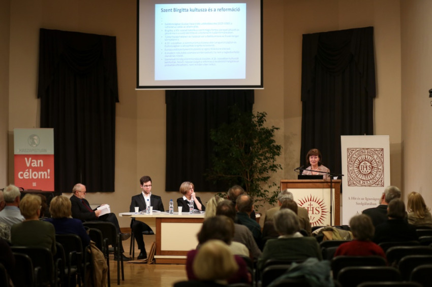 Az előadó felidézte: amikor Brigitta Birgersdotter 1303-ban megszületett, Marco Polo éppen kínai utazásának emlékeit vetette papírra, Petrarca abban az évben pillantotta meg a napvilágot. Boccaccio 1313-ban született, Dante Alighieri pedig röviddel Brigitta születése előtt ért el „élete vándorútjának feléhez”. Kőrösiné Merkl Hilda rámutatott: Szent Brigitta, Svédország védőszentje, Európa társvédőszentje és az özvegyek pártfogója még 13-14. századi mércével mérve is atipikus életutat járt be. Főúri család sarja volt, rangjához illő házasságot kötött, boldog feleség, nyolcgyermekes édesanya volt, később pedig özvegy, aki családi életének és a királyi udvarban betöltött szerepének köszönhetően gazdag tapasztalatokra tett szert.