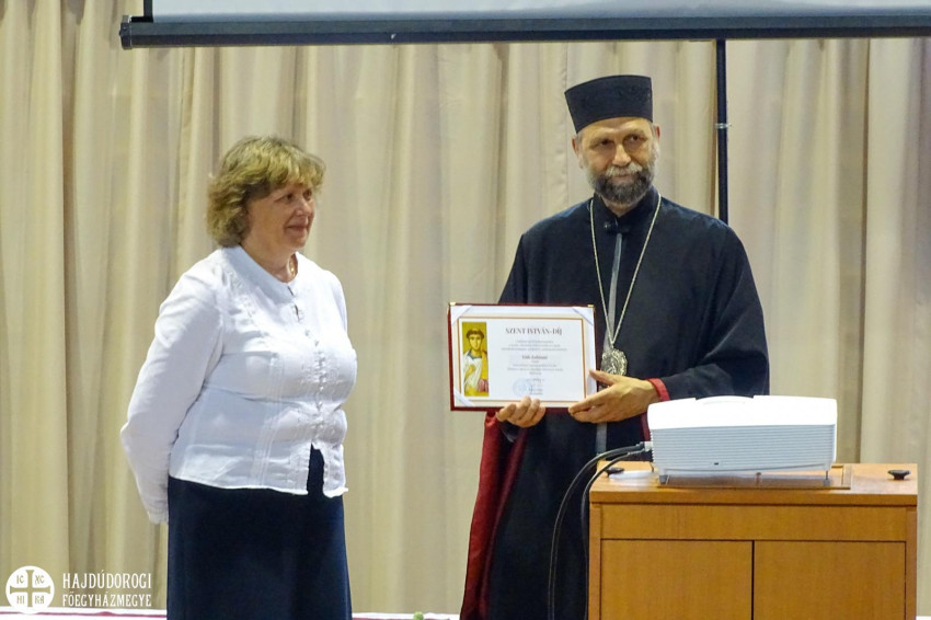 Az előadást követően Kocsis Fülöp metropolita és Czövek Éva, a főegyházmegye oktatási hivatalának vezetője átadta az idei Szent Gellért-díjakat a Hajdúdorogi Főegyházmegye fenntartásában működő köznevelési és szakképzési intézményekben dolgozóknak.