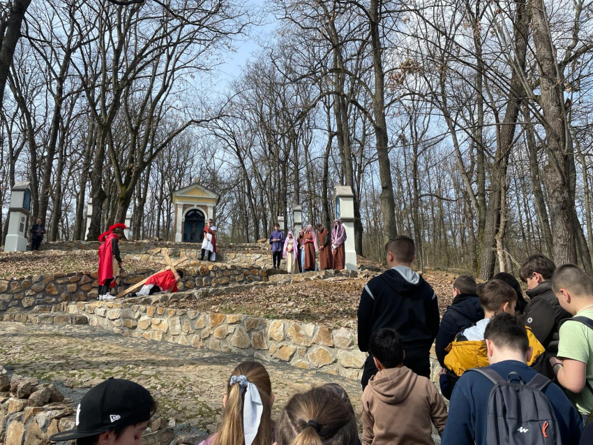 Az ebéd és a kötetlen beszélgetés után keresztúti ájtatosság következett a kegytemplom mögötti stációknál. A keresztút minden állomásán az elmélkedést az arad-ségai plébánia fiataljai vezették, rövid passiójeleneteket bemutatva.