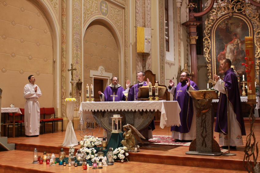 A szentmise előtt Fizer Jenő atya és Gerzánics Szergej püspöki irodaigazgató a megholtakért végeztek zsolozsmát, miközben a gyülekező hívek égő mécseseket helyeztek el az oltárnál. Ezalatt a gyóntatószékben Pohorelcev Irenej OP gyóntatott.