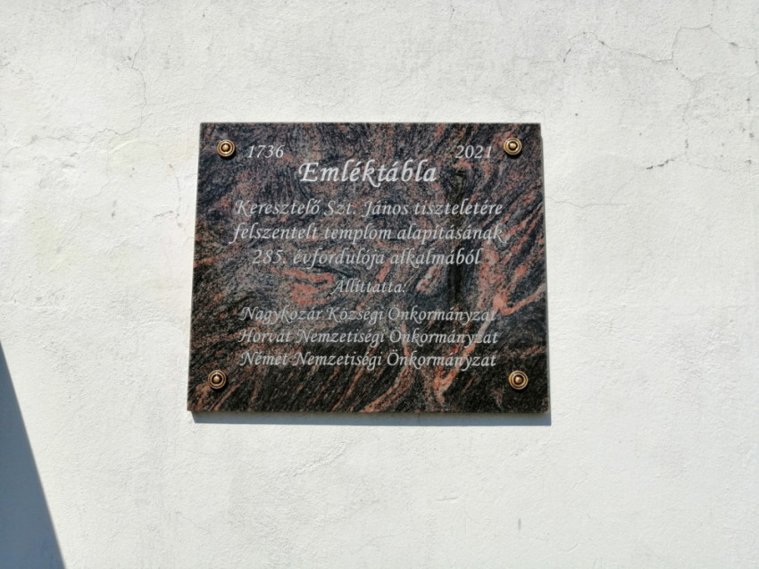 A búcsús szentmisét követően avatták fel az emléktáblát, amelyet a Nagykozár Községi Önkormányzata a Horvát és a Német Nemzetiségi Önkormányzattal együtt helyezett el a templom falán. A tábla a templomalapítás 285. évfordulójának állít emléket.