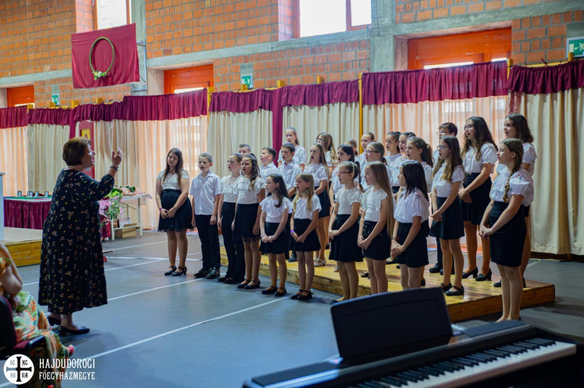 A Szent Liturgia után a tornacsarnokban tanévzáró ünnepséget tartottak, amelyet a Csengettyű Gyermekkar nyitott meg. Vezényelt: Radics Teréz, zongorán közreműködött: Szkiba Istvánné.