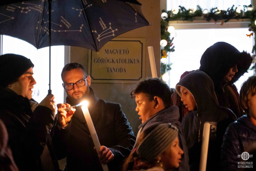 A menet már Szocska A. Ábel püspök kíséretével érkezett a Sója Miklós Görögkatolikus Általános Iskola épülete elé felállított betlehemhez.