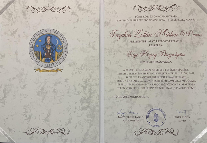 A szentmisét követően Nagy Ferenc László polgármester a Türje község díszpolgára kitüntető címet adományozta Fazakas Mártonnak, a türjei premontrei szerzetesközösség apátjának.