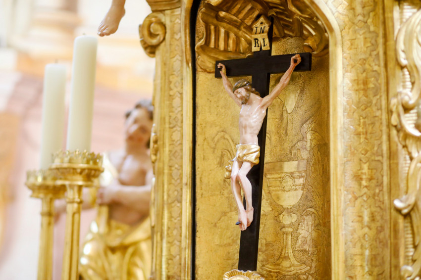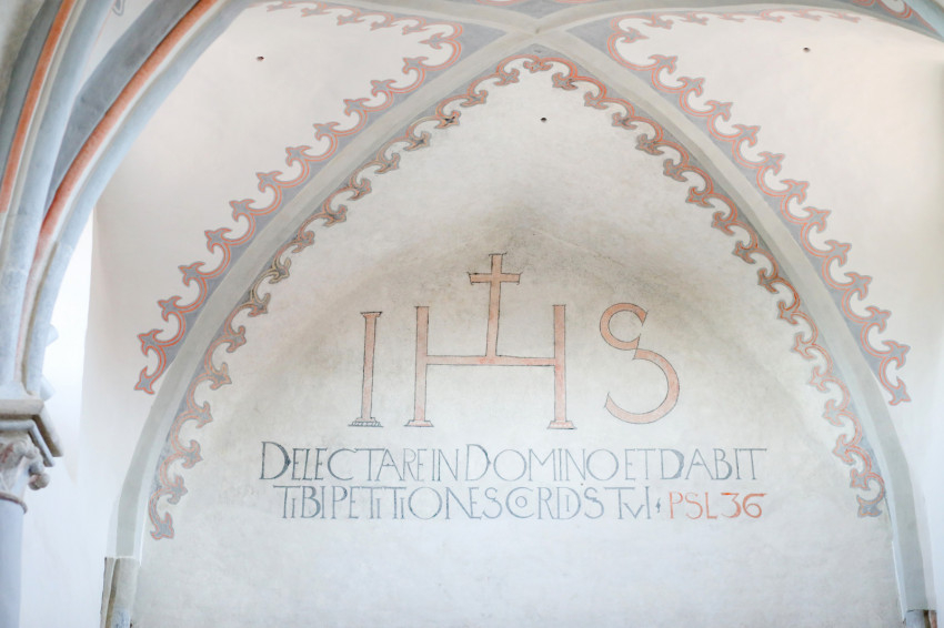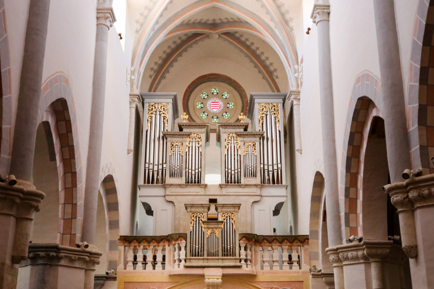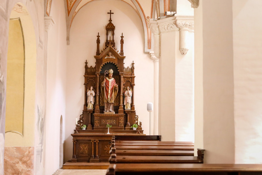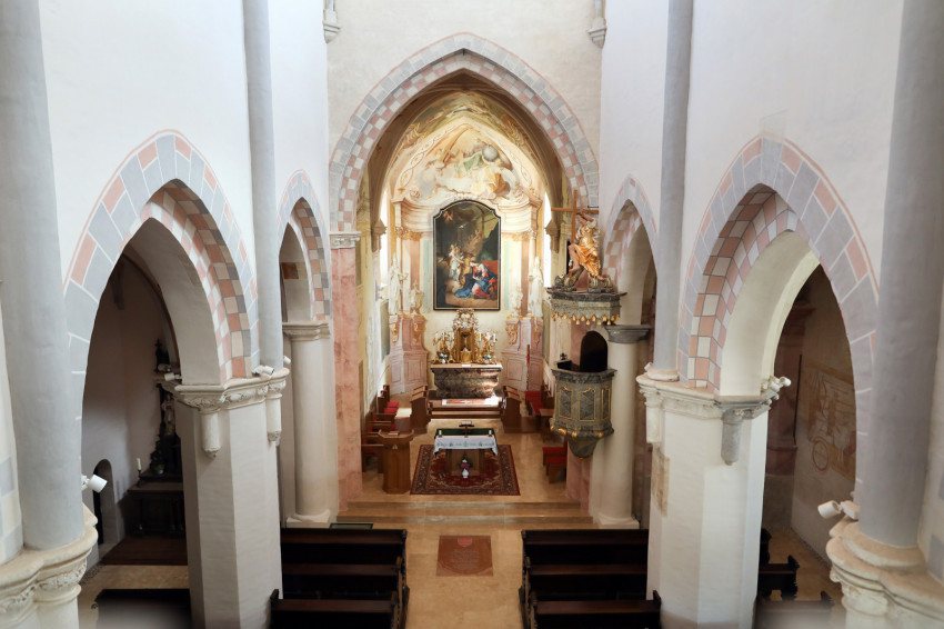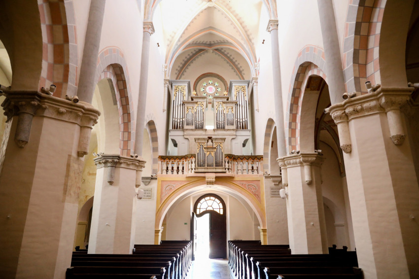 Belépve feltárul előttünk a gyönyörű, világos, háromhajós, bazilikális elrendezésű, fehérre festett templomtér. A bal oldali mellékhajóban a bejárathoz közel látható a templom első felszentelési keresztje. „Különböző korokból maradtak meg felszentelési keresztek, ha Isten megsegít, a negyediket is feltesszük augusztusban” – árulja el az apát. A barokk korban a főhajóban nagyobb ablakokat vágtak a középkori lőrésszerű nyílások helyett. Egy tanúfal jelzi az eredeti állapotot, emellett pedig a változást mutatja az is, hogy az ablakokat körülvevő feltárt zsoltárfeliratok középső szövegrészei hiányoznak az ablaknyílások barokk kori kiszélesítése miatt.