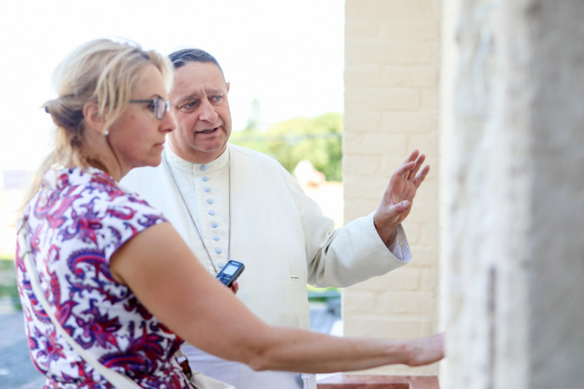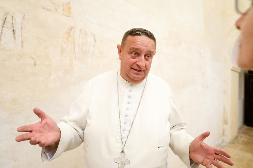 Mielőtt belépnénk a belső térbe, Fazakas Márton apát elmondja, miért kellett a téglahomlokzatot bevonni egy húsz évvel ezelőtt kifejlesztett speciális anyaggal. A templom eredeti téglahomlokzatát a török kor után barokk stílusban átépítették, amiről egy 1900 előtt készült fénykép is árulkodik. Az 1920-as években Lux Kálmán kibontotta a vakolatot, és visszaállította az eredeti állapotot, ami nagyon impozáns külsőt eredményezett. Csakhogy a savas esőktől a tégla roncsolódni kezdett, sőt egész téglák fagytak ki a falból, hiszen ezeket az 1200-as évek elején készítették. A helyszínen nem volt annyi kő, amennyire szükség lett volna az építkezéshez, így csak a templom szerkezeti váza, a pillérek, az oszlopok alapzata, a bordázatok és a díszítések készültek kőből. A feltárás során az is kiderült, hogy a pilléreket nyolc méter mélyre helyezték a talajba.