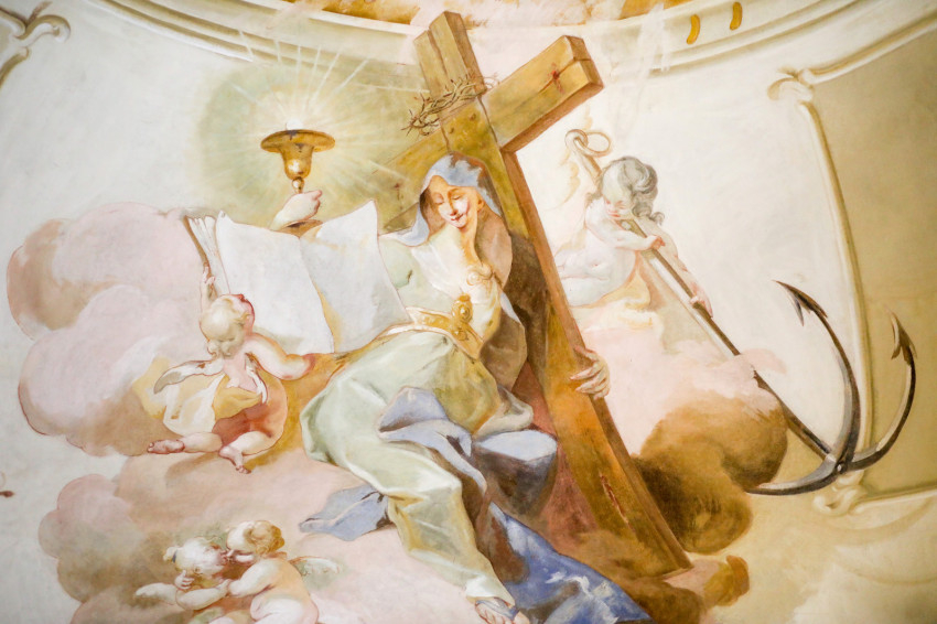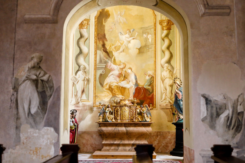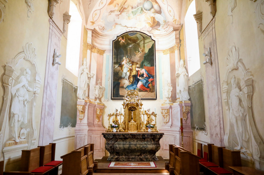 A Szent Anna-kápolna festészeti munkálatait is Dorfmeister István végezte. A 17. századból származó Vigasztaló Szűz Mária-szobrot most újítják fel a Képzőművészeti Egyetemen, hiszen a felirat szerint „kontár kezek átfestették”. Ez várhatóan a templomszenteléskor fog a helyére kerülni. Szent Vendelt a környéken nagy tisztelet övezi, szobra a bejárattól jobbra kapott helyet. A keresztelőkút mögé a művész megfestette a Jordánt, a falakra és a csegelyekre a négy egyházatyát és a négy evangélistát, a mennyezeten pedig a Jóistent láthatjuk hosszú, ősz szakállal, a világgömbbel, kerubokkal és szeráfokkal. Az oltárkép felett, amely Szent Annát ábrázolja, amint olvasni tanítja a gyermek Szűzanyát, a hit-remény-szeretet allegóriája látható kereszttel, horgonnyal és kehellyel. A kápolna falain minden mozgalmas, színes, virágos, a puttók is szeretik egymást, csókot váltanak.