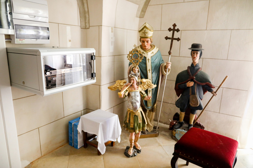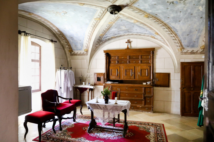 A sekrestyeajtó és a fölötte lévő ablak a déli oldalon elhelyezkedő barokk kori kolostorra nyílik, amelyben 1950-től szociális otthon működött, most pedig idősotthon. „A rend visszakapta a kolostorépületet is, ahol ma 75 idős szegény ember kap tisztességes életlehetőséget. Le a kalappal az otthon személyzete előtt, nagyon becsületesen és szeretettel végzik a munkájukat. Nem is gondolkodtunk abban, hogy mi használjuk az épületet. Egy darabig a kolpingosok működtették az idősotthont, most a püspöki kar által létrehozott KOSZISZ a fenntartója. A felújításába beszálltunk, amennyire csak tudtunk. Mindig van mit tenni az épületben, sikerült megoldani az akadálymentesítést is, az örökségvédelem ebben messzemenően együttműködött. A ház legkisebb részét használjuk most plébániának.”