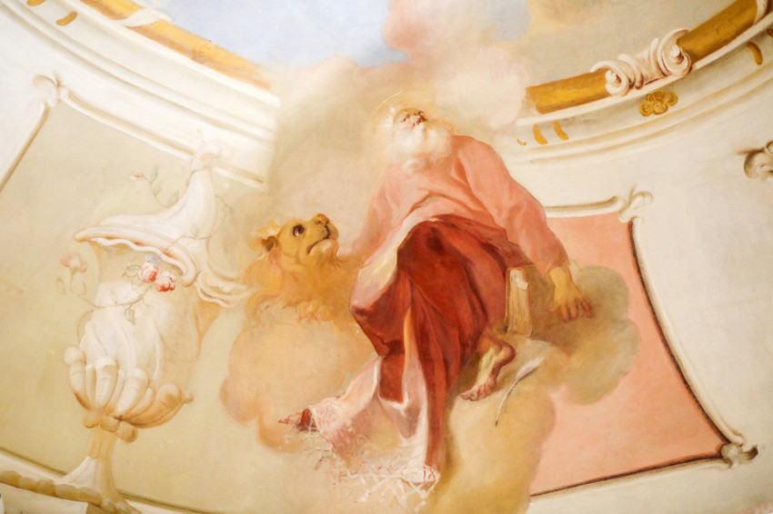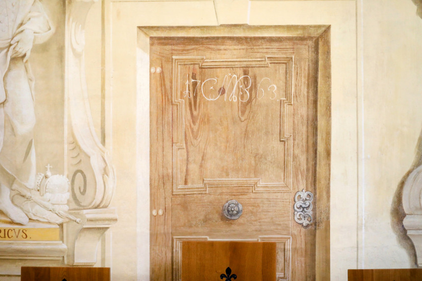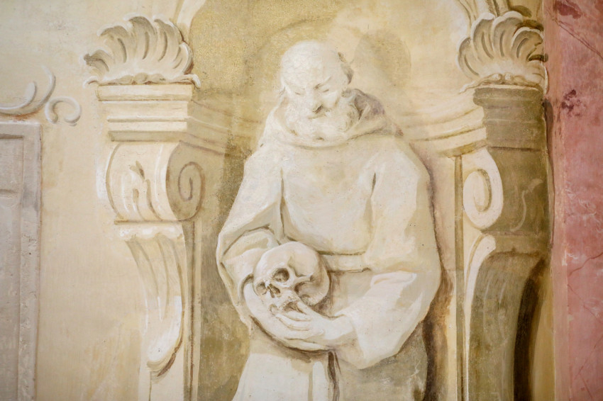 A fiatal művész első és legnagyobb magyarországi műve a Gyümölcsoltó Boldogasszony-oltárkép. A szentély oldalfalaira Szent Imre, Szent László, Szent István és egy negyedik alak szobrait festette meg grisaille technikával. Az Árpád-házi szentek felismerhetők az attribútumaikról, s hármójuk ábrázolása alatt a nevük is szerepel. A negyedik, látszólag ferences ruhát viselő, felirat nélküli szakállas alaknak csak sejteni lehet a kilétét. „Mit keresne franciskánus barát a premontreiek templomában? Van egy elfelejtett Árpád-házi, sokáig szentként tisztelt férfiúnk, Salamon, akiről a visegrádi Salamon-tornyot is elnevezték, hiszen ott raboskodott. A művészettörténészek szerint a négy férfit legtöbbször együtt szokták ábrázolni. Beazonosították, de a nevét nem írták a férfialak alá.”