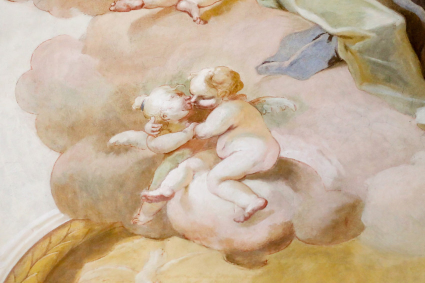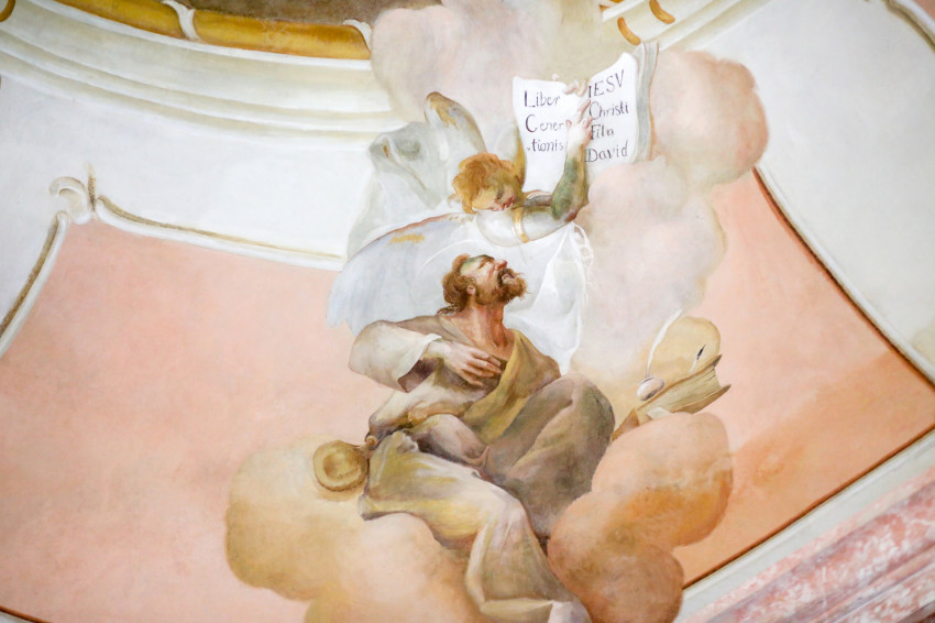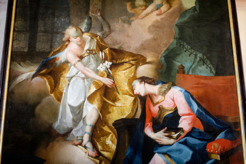 A templom szentélyében balra fent egy eljegyzési jelenet látható. A zsidó főpap előtt Szent Anna és Szent Joachim vagy Szűz Mária és Szent József fogadnak hűséget egymásnak. A kép alá illuzionisztikus ajtót és ablakot festettek, éppen szemben a sekrestyeajtóval és az oratórium ablakával, hiszen a barokk kedveli a szimmetriát. „Ötletesen örökítették meg a keletkezés évszámát: a festett ajtón a házszentelési feliratban szerepel az 1763-as évszám, mintha csak a kántor pingálta volna oda.” A színhasználat szürke monokróm, de néhol rózsaszín és zöld is, egy függönyt imitáló festménynek pedig, amely az oltár mögött futó kárpitot jelképezi, egészen meghatározhatatlan a színe. A szentély jobb oldalán fent Szűz Mária születését és Gyümölcsoltó Boldogasszonyt ábrázolják a Dorfmeister-festmények.