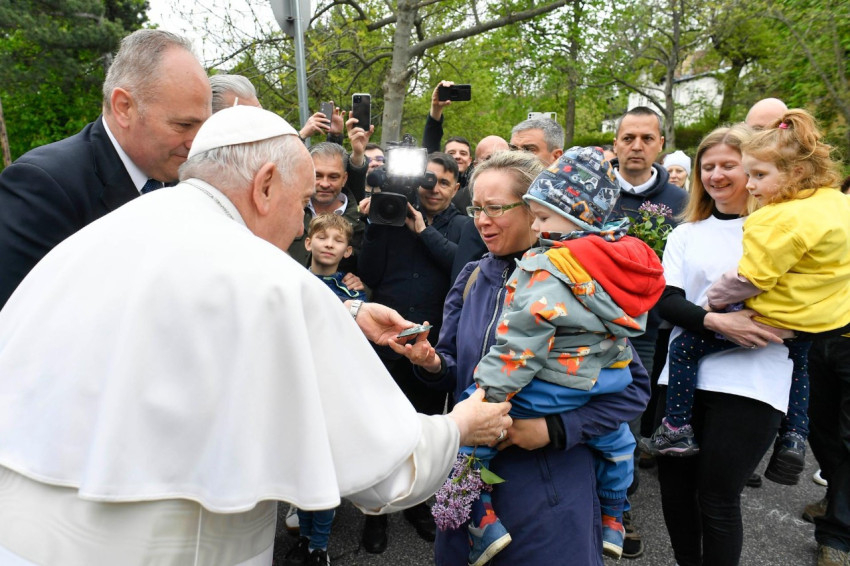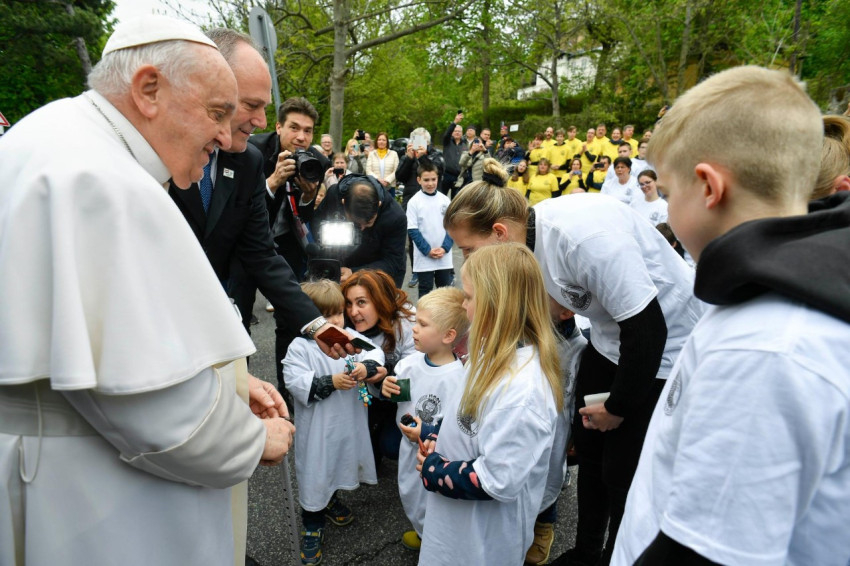 Ezt követően még több mint tíz percet töltött a Szentatya az őt köszöntő felnőttekkel és gyerekekkel, kezet fogott velük, és rózsafüzéreket ajándékozott nekik.