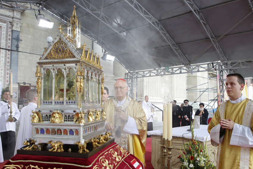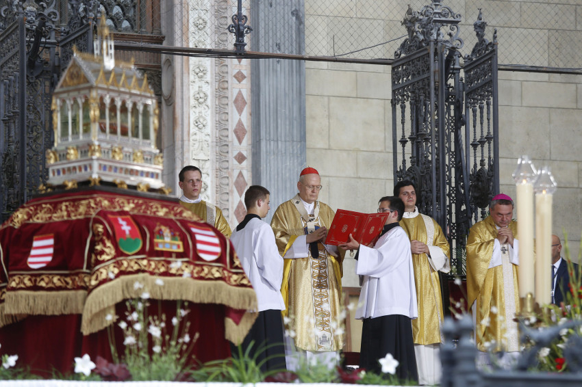 Ezt követően elhelyezték a Szent Jobbot az oltár mellett, majd Horváth Zoltánnak, a Szent István-bazilika plébániai kormányzójának vezetésével elimádkozták a Szent István király-litániát.