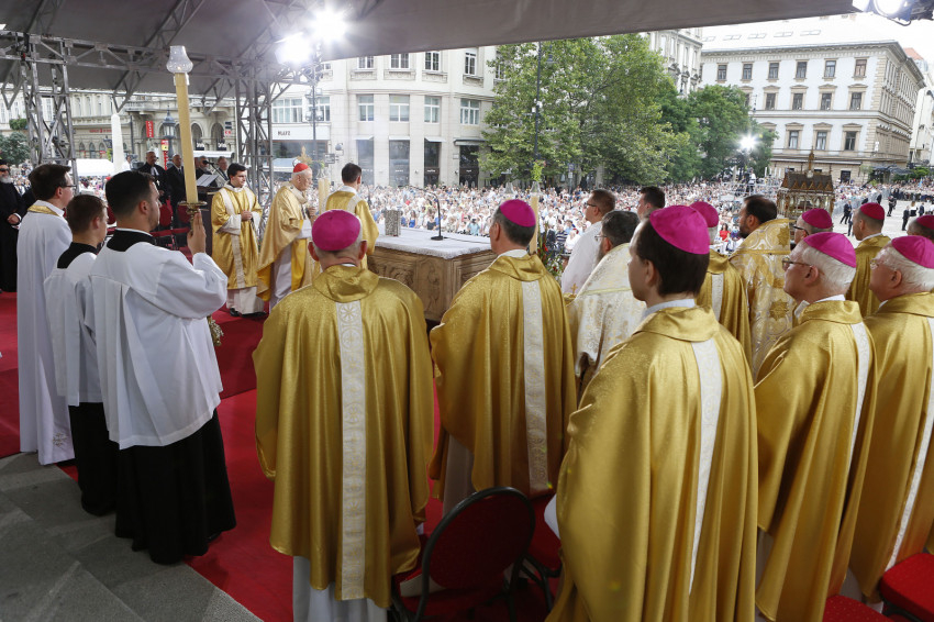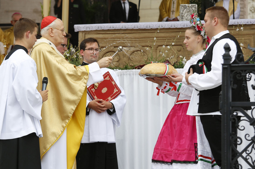 Az ellentétes hírek, a változó helyzet nyomán a változó intézkedések, a sokszor bezártabb életmód, a személyes kapcsolatok megritkulása sokakat lélektanilag is megviselt. Krisztus azonban nem hagy magunkra minket. A keresztségben és az Oltáriszentségben megújítja életünket, és csodálatos dolgokra tesz képessé bennünket. Az idén különös reménnyel kérjük ezt a megújító kegyelmet Tőle. Bízunk benne, hogy szeptember elején, a Nemzetközi Eucharisztikus Kongresszuson itt, Budapesten örömben és erőben találkozhatunk vele. Átélhetjük, hogy a magyarság és a kereszténység ezer éve együtt járja útját, és hivatást kapott arra, hogy továbbadja Krisztus szeretetét az egész világnak. Ezzel a bizalommal áldjuk meg most az új kenyeret, kérünk reményt és békességet népünk és az egész emberiség számára.