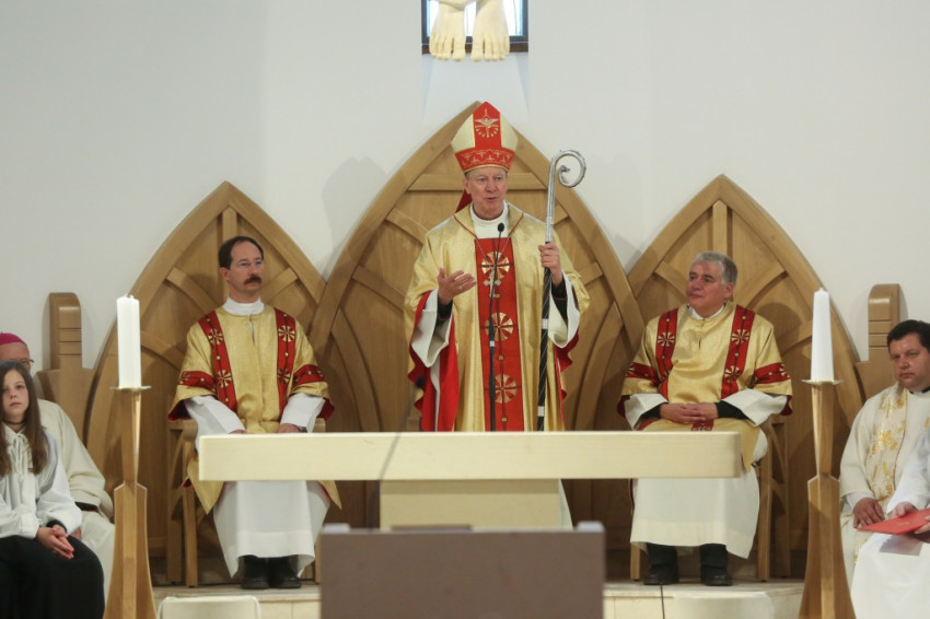 A főpásztor a homíliában kifejezte „a mindenki szívében lévő örömet”; felidézte a templomépítés előzményeit, kiemelve az egyetértésben zajló közös munkát, mely a Szentlélek ajándéka. Sok ajándékot kapunk, ha hiszünk az isteni szeretetben – a Lélek ajándékait is megkapjuk. Mindaz, ami emberré tesz minket, a Lélek ajándéka – hangsúlyozta. Pál apostol a Lélek gyümölcseiről ír – ezeket osztja meg velünk az Úristen.
