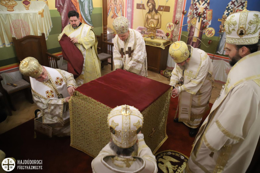 A szentelés legelején az elhelyezendő ereklyéket, Szent Flórusz és Laurusz vértanúk relikviáit díszes menet hozta a kápolna bejáratához, majd a püspökök, papok és hívek egymás után léptek be a helyiségbe. Az ereklyék ünnepélyes elhelyezése után vörösborral és rózsavízzel mosták le az oltárt, majd szappannal kereszt alakban megjelölték az oltár lapját, és kezükkel átmosták azt. Miután az oltárt a kendőkkel teljesen szárazra törölték, az oltár fölkenése és felöltöztetése következett. A szentelés következő mozzanata, amelyet már a hívek is láthattak, a templom falainak megszentelése volt: Orosz Atanáz püspök müróval kente meg, Szocska Ábel püspök szenteltvízzel hintette meg, Kocsis Fülöp metropolita pedig tömjénezővel áldotta meg a falakat.
