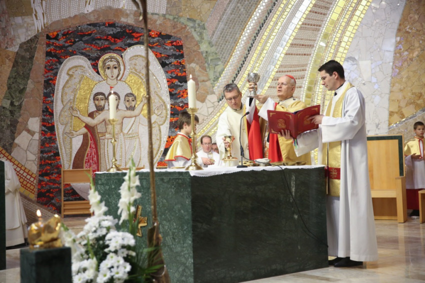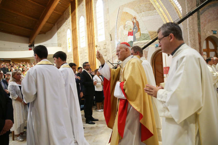 Templomszenteléskor a címadó szent ereklyéit is el szokták helyezni. De az angyalok szellemi lények, ezért a mai ünnepen különleges ereklyéket szeretnék átadni, hogy őrző helyük és tiszteletük központja ez a templom legyen. Négy libanoni szent ereklyéjét, amelyeket idei libanoni látogatásom során a Maronita Katolikus Egyháztól kaptam. Az első Szent Charbel ereklyéje. Ő szerzetes, kiváló lelkipásztor, majd hosszú éveken át remete volt, akinek közbenjárására számos csoda történt és történik napjainkban is. Sok reménytelen helyzetben lévő beteg és útkereső ember köszöni neki a gyógyulást, vagy a szabadulást kilátástalan helyzetéből. Az ő tisztelete már elterjedt az egész világon. Hazánkban is sokan ismerik. Szent Rafka imádságban élő apáca volt, aki szenvedéseit ajánlotta fel Krisztusnak. Különösen a családok pártfogójaként tisztelik. Szent Nimatulla kiváló teológus volt. Boldog Esteban pedig laikus testvér, aki mindenkinek készségesen szolgálatára állt. Adja Isten, hogy ez a templom az ő tiszteletüknek is országos központja legyen, zarándokhely, ahol imádságban is kifejezhetjük együvé tartozásunkat a Közel-Kelet üldözött keresztényeivel, és részesülhetünk lelki gazdagságukban.